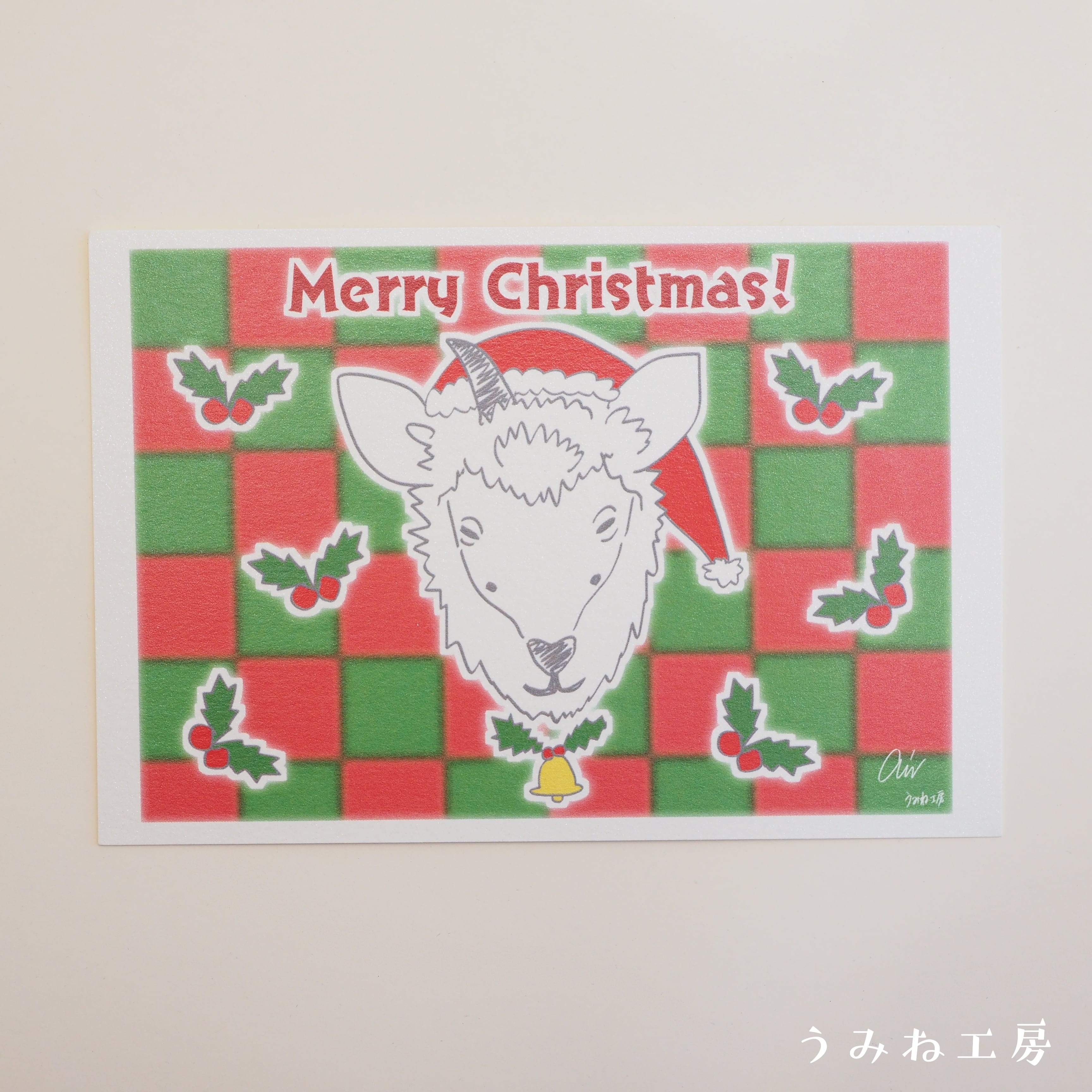 サンタクロースに扮した『HAGURE KAMOSHIKA』のクリスマスをイメージしたポストカード。